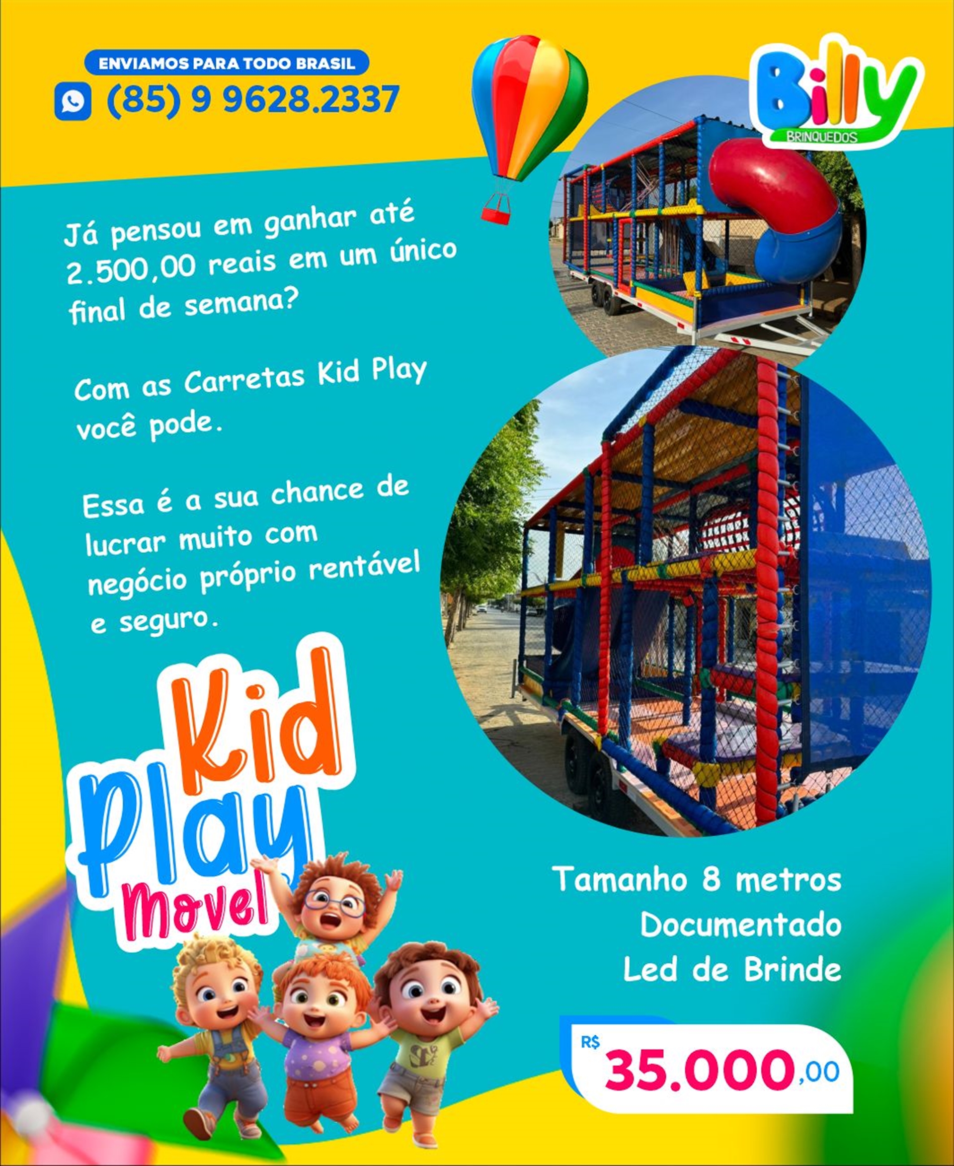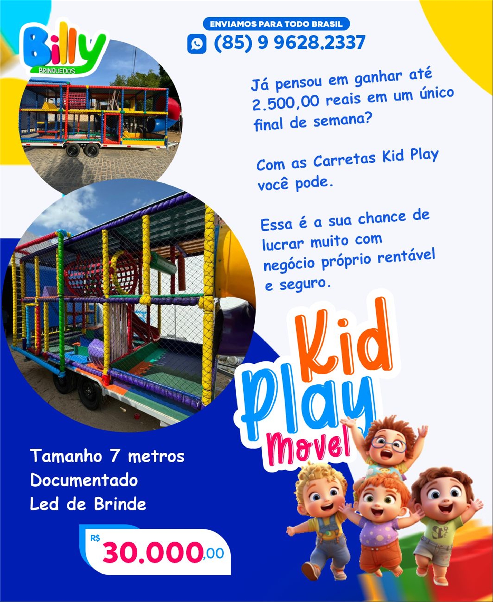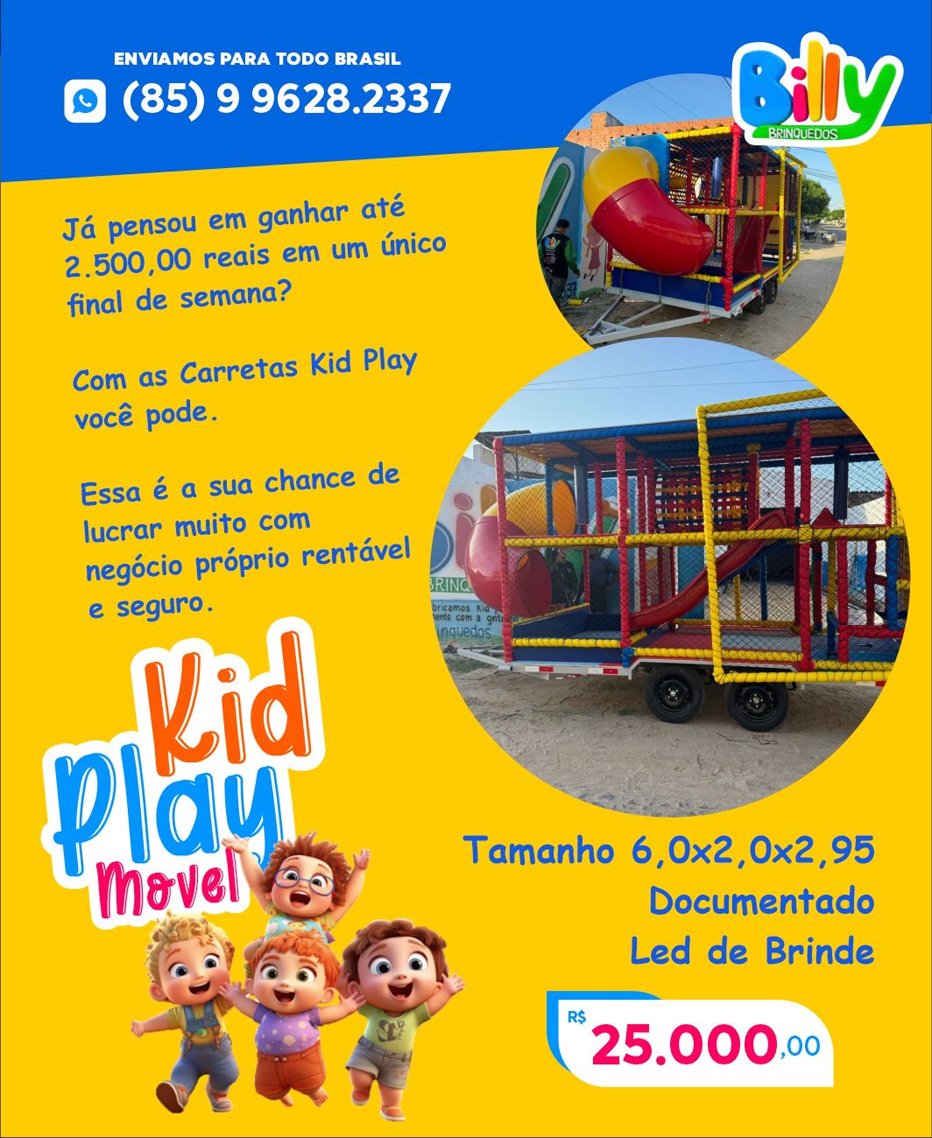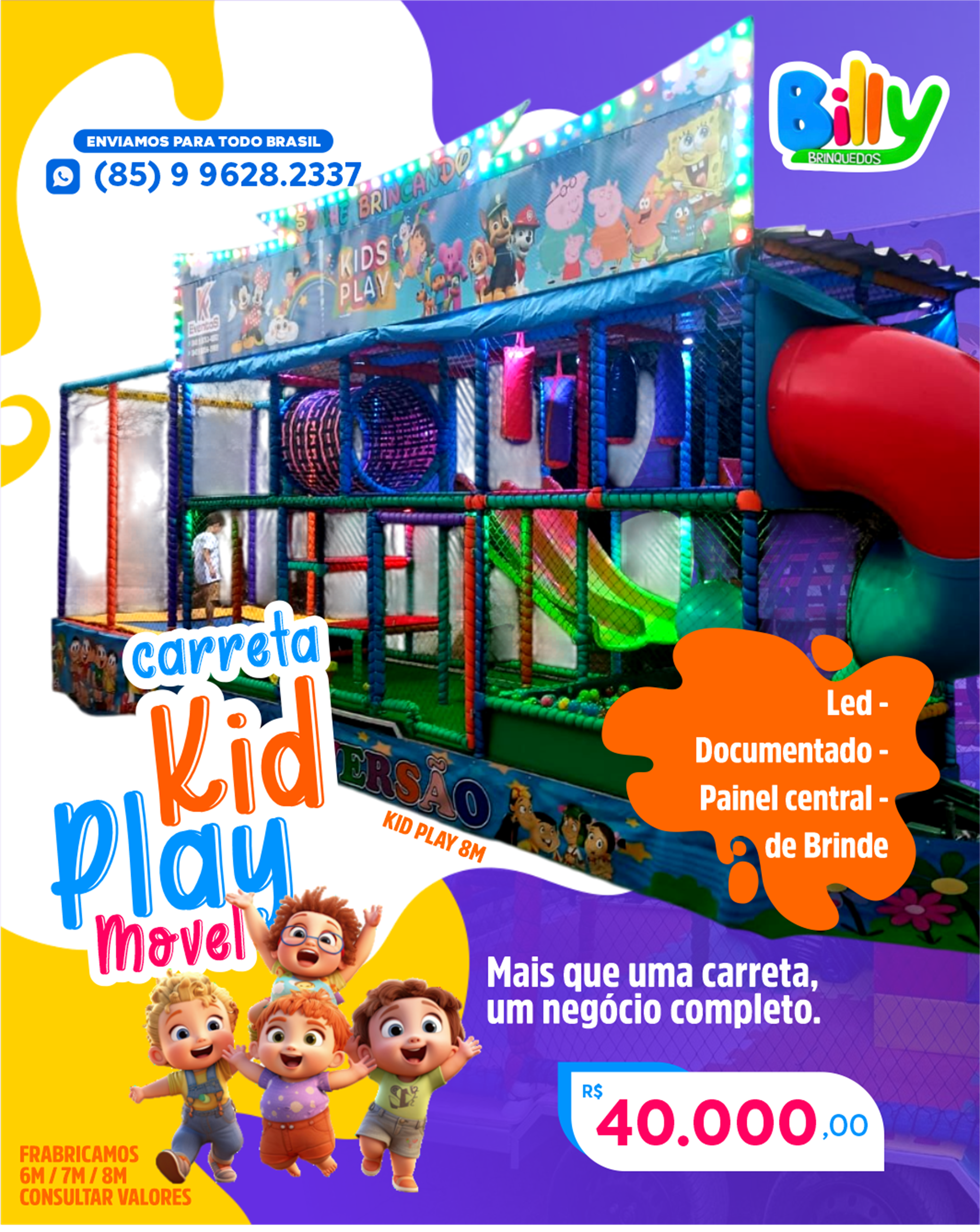 👉 O Kid Play Móvel é montado em uma carretinha, ideal para quem deseja levar o brinquedo para diferentes locais, como eventos e festas. Já o Kid Play Fixo é instalado de forma permanente no espaço, indicado para restaurantes, escolas, igrejas e estabelecimentos que querem fidelizar famílias com uma área kids exclusiva.